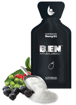 Með B.EN GEL færðu orku í hlaupi. Sérstakt bragð, keimlíkt næringarríka drykknum okkar B.EN ENERGY. Náttúrulega rauður liturinn og sætubragðið eru eingöngu upprunnin úr gæðasafa eða mauki (Safa innihald: 86%). Þykkni úr guarana, grænu tei og kaffiberjum gefa gelinu örlítið biturt bragð og eru um leið náttúrulegar uppsprettur örvandi koffíns. Koffínið úr guaranaplöntunni sem kemur frá Amazon svæðinu, er vel þekkt fyrir langvarandi og dreypandi áhrif. Þetta stafar af því að koffein er bundið öðrum efnum og fer því hægt út í líkamann og lengir orkuskotið. Þar að auki inniheldur B.EN GEL vítamínið kólín, sem verður að acetýlkólíni í efnaskiptum líkamans, sem er mikilvægtr taugaboðefni eða framlengjari taugaboða. C-vítamín styður ónæmiskerfið og hjálpar til við að koma á stöðugleika á huga okkar. B-vítamín verndar taugakerfið og stuðlar einnig að betri einbeitingu.